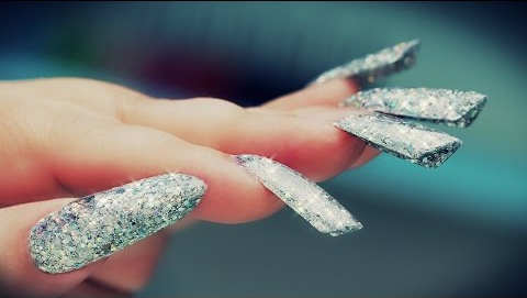 Edge Glitter Acrylic Nails. hi it's easy from New York education and i found a new color i'm in love with it's called silver cocktail I'm going to do an edge nail something really different let's get started so the edge nail is one of those kind of newer nail shape so they're kind of futuristic in my opinion and what makes it so neat is that it's so different than a conventional mail it doesn't have that nice arch and very natural looking shape this one kind of defies natural we're just going to go crazy and futuristic with this one we're really focusing on a v-up into the front looks like a ridge like a spine you might think it's quick different so in order to get that Ridge want to take a regular form you can even do a stiletto form we're going to them long but we don't need to still little form and then you can see on this forum has a line down the center so I'm gonna take it and I'm going to literally bend it keep it on the paper though if you peel it off and bend it will stick to itself then you're gonna have to throw a shirt again so take the center line and just crease it can get pretty strong crease.